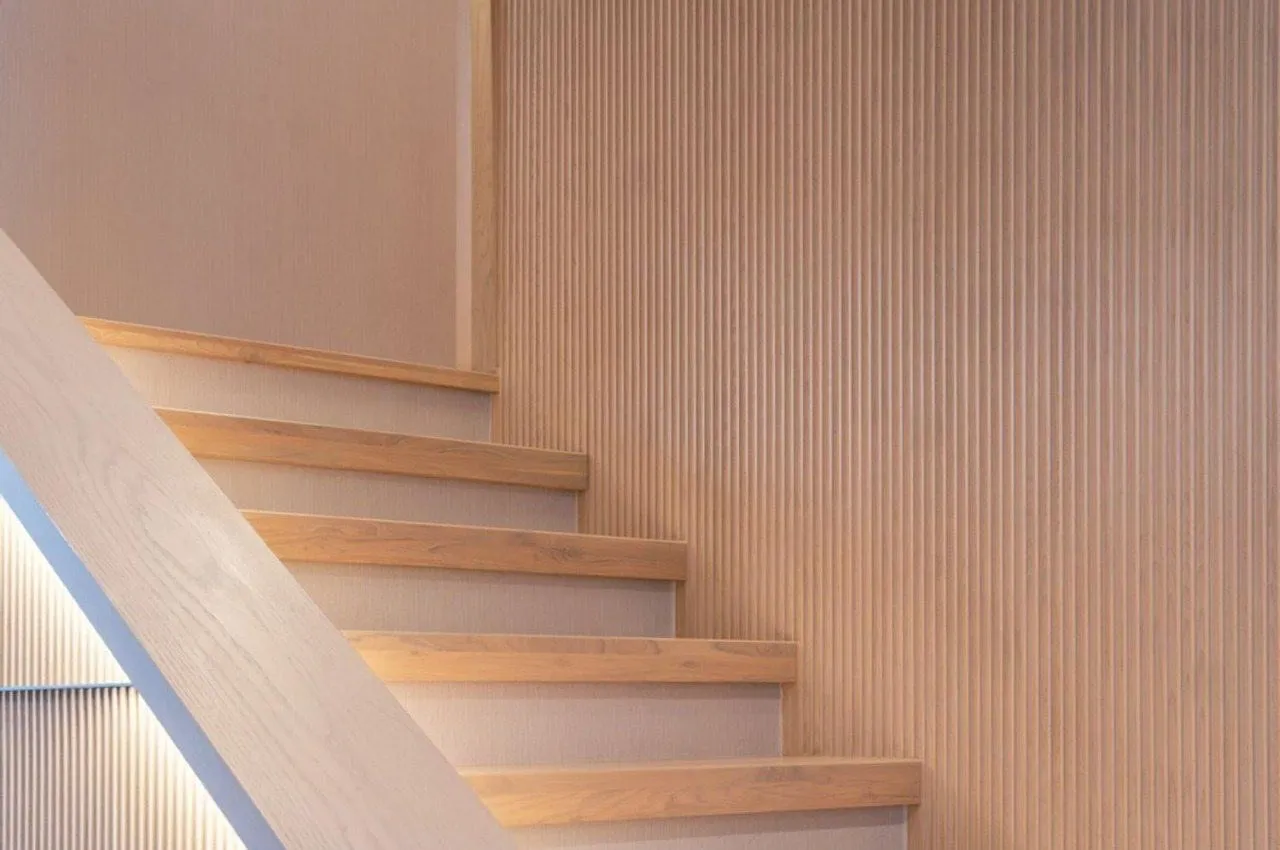 Лестница из ясеня: премиальная облицовка ступеней с характером камня и теплом дерева